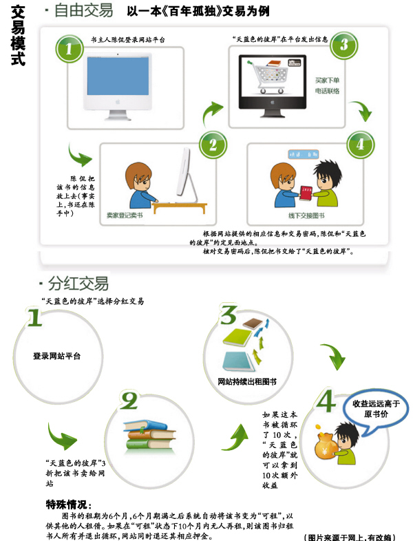 為嘗鮮,陳侃把一本《百年孤獨》放到該網(wǎng)站平臺上自由交易,說是“賣”給了圖書館,其實這本書還存放在陳侃的書柜上,只不過名義上歸了圖書館,并被登記到了“賣出信息”一欄,想租這本書的顧客可通過網(wǎng)站賣書。
