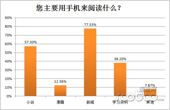 用戶主要用手機來閱讀什么內(nèi)容呢?從上圖可以看到57.30%的用戶使用手機閱讀小說,12.36%的用戶使用手機閱讀漫畫,77.53%的用戶使用手機閱讀新聞,使用手機了解新聞信息的用戶數(shù)占比最多,使用手機及時獲取新聞咨詢是一種趨勢,另外還有38.20%的用戶通過手機閱讀學習資料。