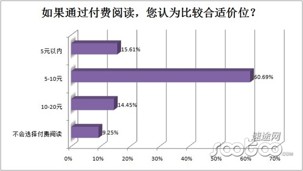 如果進行付費閱讀,用戶能接受的價位5-10元最多,比例為60.69%;15.61%的用戶只能接收5元以內(nèi)的付費閱讀,也有9.25%的用戶不會接收付費閱讀?磥砀顿M閱讀的道路很難走,相關企業(yè)還需另謀出路。