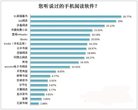 手機閱讀軟件已經(jīng)非常多,那么用戶聽說過的手機閱讀軟件又是哪些呢?91熊貓看書排在第一位,30.77%的用戶聽說過,QQ閱讀排在第二位,29%的用戶聽說過;多看閱讀排在第三位,25.12%的用戶聽說過,其次還有掌閱iReader、iBooks、Kindle(手機應用)、云中書城、豆瓣閱讀等。
