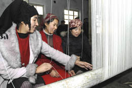 幫助群眾就業(yè)。1月3日,在新疆庫車縣庫木艾克社區(qū)居委會,老師左然木(左一)在教農(nóng)民織地毯。新華社記者:季春鵬 攝 |