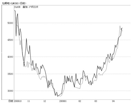 伴隨著商品市場的逐步回暖,期市資金品種流向差異化特征明顯,其中金屬期貨品種因前期國儲收購等因素支撐,成交和持倉均大幅增長,吸引資金青睞。 國內(nèi)三大期貨交易所日前公布的交易統(tǒng)計數(shù)據(jù)顯示,三月份上期所成交4.01萬億,大商所成交2.04萬億,鄭商所成交1.71萬億,分別比二月份增長65.73%、32.46%和16.32%。其中,上海期銅成為當月成交金額最大品種,滬銅成交額達2.13萬億,同比增長113.40%,占所有上市品種的27.45%。 上圖是LME三個月期銅與滬銅指數(shù)的疊加圖,我們看到,內(nèi)盤外盤聯(lián)動性非常好,且市場的特征已經(jīng)由從前的外強內(nèi)弱轉為內(nèi)強外隨。 截至4月15日,LME三個月期銅報4852.5美元,與年初相比,上漲了近50%,這是自2006年6月以來的最大季度漲幅。而同期滬銅指數(shù)上漲的幅度近59%,遠遠超過了LME銅。從第一季度的走勢上看,有15個交易日滬銅的上漲是領先于LME銅的。滬銅參與全球定價的影響力日益增強,價格變化基本反映國內(nèi)市場供求狀況,并與國際市場行情良性互動,發(fā)現(xiàn)價格信號的功能充分顯現(xiàn)。 盡管工業(yè)用金屬的價格敏感度低,同時受工業(yè)生產(chǎn)周期的影響,需求恢復滯后于能源商品,但隨著去庫存化接近尾聲,大量投資于基建的政府刺激計劃開始生效,一些基礎金屬需求有望在今年上半年見底,并將在下半年得到改善。