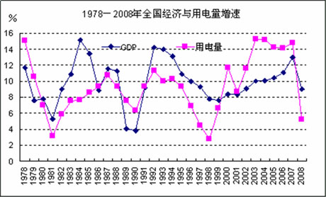 電力工業(yè)是國民經(jīng)濟(jì)的基礎(chǔ)產(chǎn)業(yè),為國民經(jīng)濟(jì)的發(fā)展提供動(dòng)力支持。通過分析1978年以來國民經(jīng)濟(jì)、電力消費(fèi)、發(fā)電裝機(jī)等增長情況,不難發(fā)現(xiàn),經(jīng)濟(jì)周期與電力消費(fèi)增長、發(fā)電裝機(jī)增長以及電力供需形勢的關(guān)系還是有規(guī)律可循的。 電力消費(fèi)與經(jīng)濟(jì)發(fā)展密切相關(guān)。1978年以來全國用電量增速與經(jīng)濟(jì)增速變化如圖所示。經(jīng)濟(jì)學(xué)告訴我們,經(jīng)濟(jì)發(fā)展具有一定的周期性。1978年以來,我國國民經(jīng)濟(jì)增長明顯存在三個(gè)周期,分別是1981年至1989年、1990年至1998年及1999年以來。受國際金融危機(jī)等因素的影響,2008年我國經(jīng)濟(jì)快速進(jìn)入了下降通道。 由于經(jīng)濟(jì)發(fā)展的周期性特點(diǎn),電力消費(fèi)增長也具有周期性,并且電力消費(fèi)增長周期與經(jīng)濟(jì)發(fā)展周期基本同步。盡管兩者存在相同的周期,但在不同的經(jīng)濟(jì)發(fā)展階段,兩者的變化特點(diǎn)是不一樣的。比如,1995年至1998年經(jīng)濟(jì)屬下行階段,經(jīng)濟(jì)增速下降了3.1個(gè)百分點(diǎn),全社會用電量增速下降了6.5個(gè)百分點(diǎn),用電量增速下降幅度比經(jīng)濟(jì)增速下降幅度高出3.4個(gè)百分點(diǎn);1999年至2007年是經(jīng)濟(jì)上行階段,經(jīng)濟(jì)增速提高了5.4個(gè)百分點(diǎn),而用電量增速提高了8.2個(gè)百分點(diǎn),用電量增速上升幅度比經(jīng)濟(jì)增速高2.8個(gè)百分點(diǎn);2008年,受國際金融危機(jī)以及我國經(jīng)濟(jì)周期下行等因素影響,經(jīng)濟(jì)增速下降了4個(gè)百分點(diǎn),而全社會用電量增速下降了9.6個(gè)百分點(diǎn),用電量增速下降幅度比經(jīng)濟(jì)增速高5.6個(gè)百分點(diǎn)。 由此可見,電力消費(fèi)增速作為反映經(jīng)濟(jì)增長的先行指標(biāo),在近十幾年的波動(dòng)幅度要大于經(jīng)濟(jì)增速的波動(dòng)幅度。當(dāng)經(jīng)濟(jì)增速回落時(shí),用電增速出現(xiàn)明顯回落;當(dāng)經(jīng)濟(jì)增速上升時(shí),用電增速也出現(xiàn)明顯上升。 長期以來,我國的電源建設(shè)項(xiàng)目均需要國家有關(guān)部門審批或核準(zhǔn)。在經(jīng)濟(jì)下行階段,國家會相應(yīng)減少電源項(xiàng)目的開工建設(shè)規(guī)模;但在經(jīng)濟(jì)上行階段,由于缺少對經(jīng)濟(jì)運(yùn)行周期的預(yù)先準(zhǔn)確判斷,往往是在經(jīng)濟(jì)開始處于上升階段時(shí)才大量增加電源新開工項(xiàng)目;由于電源建設(shè)工期較長,從而導(dǎo)致發(fā)電裝機(jī)增速滯后于經(jīng)濟(jì)增速變化,電力供需緊張,進(jìn)而影響到經(jīng)濟(jì)發(fā)展。例如2000年以來,我國經(jīng)濟(jì)開始進(jìn)入新一輪增長周期,但發(fā)電裝機(jī)增速持續(xù)下降,到2002年僅增長5%左右,遠(yuǎn)低于GDP增速和用電量增速,從而導(dǎo)致2003至2005年出現(xiàn)了全國性電力供應(yīng)緊張局面。
