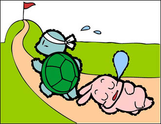 股市也類似龜兔賽跑。短線高手就如兔子一樣,憑借先天的優(yōu)勢(shì),開始的時(shí)候,他們跑得很快,所以遠(yuǎn)跑贏大盤。但是因?yàn)榕艿每,所以累得也快;而?dāng)他很累的時(shí)候,卻又比較自負(fù),過于得意洋洋,自然免不了麻痹大意,不小心一失誤,如買中一個(gè)陷阱重重的爛股,就像兔子一樣睡懶覺,當(dāng)他們被套的時(shí)候,時(shí)間也是過得飛快,就會(huì)白白錯(cuò)失牛市的大好時(shí)機(jī),最后他們除了可能遠(yuǎn)跑輸大盤之外,還可能全盤皆輸。而那些長線投資者,因?yàn)椴惶惫圆痪o不慢,就像烏龜一樣,慢慢爬行,優(yōu)哉游哉,以逸待勞,所以跑得相對(duì)比較輕松,沒有多少壓力,到最后在慢慢爬行中,卻不知不覺就跑贏了時(shí)間,遠(yuǎn)遠(yuǎn)跑贏了大盤,成了最后的大贏家。