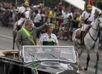 9月7日是巴西紀(jì)念獨(dú)立日,巴西總統(tǒng)盧拉(左)與夫人一起抵達(dá)在巴西利亞舉行的獨(dú)立日閱兵儀式現(xiàn)場(chǎng)時(shí)向人們揮手致意。新華社/路透 |