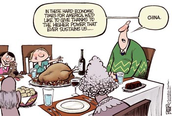 這個(gè)經(jīng)濟(jì)不景氣的感恩節(jié),我們需要感恩中國(guó)。(摘自美國(guó)政治漫畫(huà)網(wǎng))