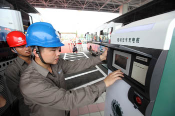 8月10日,在湖北襄樊市鄧城電動汽車充電站,工作人員準備為電動大客車充電。 當日,襄樊市鄧城電動汽車充電站正式投入使用,它是湖北首座電動汽車充電站。該充電站可同時為10輛大巴、20輛中巴和30輛轎車充電。它還設有50組蓄電池的電動汽車換電區(qū),可直接更換蓄電池,減少電動汽車電能補給時間,滿足應急充電需求及長途旅行需要!⌒氯A社發(fā)(張文華/攝)
