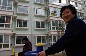 近日,蘭州市城區(qū)的5個(gè)行政村183戶居民徹底結(jié)束了“農(nóng)民”的生活,變身“市民”,住進(jìn)了小康住宅樓。蘭州市自2006年大力實(shí)施“城中村”改造以來,目前城中村改造基本完成。全市共審批“農(nóng)轉(zhuǎn)非”戶籍32109戶,占應(yīng)審批農(nóng)戶的100%。圖為蘭州市安寧區(qū)孔家崖街道城中村改造后的康居小區(qū)內(nèi),幾名剛剛由農(nóng)民變?yōu)槭忻竦木用裾谛^(qū)內(nèi)鍛煉身體。新華社記者