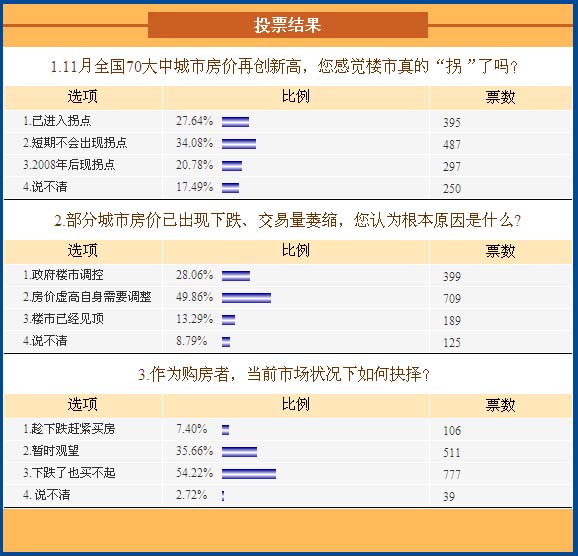 記者了解到,有關樓市是否出現(xiàn)拐點的爭論絕非偶然。最近一段時間,關于廣州、深圳樓市降價、開始促銷的消息吸引了眾人的眼球,北京、上海樓市“有價無市”的消息也頻頻見諸報端,成了這場爭論的直接“導火索”。 在北京東四環(huán)某售樓處,前來看房的張小姐對記者說:“最近一段時間,有關北京房價出現(xiàn)松動的報道多了,我過來了解一下情況。唉,看了幾個樓盤,價格還是比前一段時間高呀!” 對于未來的房價走勢,張小姐說,深圳都已經(jīng)降價了,我覺得北京也挺不了多久了,“拐點”應該出現(xiàn)了。我決定再觀望一段時間等房價下調(diào)了,再考慮購房。 記者發(fā)現(xiàn),與張小姐的觀點相同,多數(shù)接受網(wǎng)絡調(diào)查的消費者也認為樓市“拐點”來臨。根據(jù)新浪網(wǎng)進行的“您認為樓市是否出現(xiàn)拐點”調(diào)查顯示:在總共1678人參加的調(diào)查中,有61.08%的被調(diào)查者認為樓市“拐點”已經(jīng)來臨;27.23%的被調(diào)查者認為現(xiàn)在談拐點為時尚早;另有11.68%的人認為不確定。 對于您認為當前的樓市拐點是什么,61.44%的被調(diào)查者認為是房價由快速上漲到理性調(diào)整;27.41%的被調(diào)查者認為是房價由上漲到下跌;11.14%的人認為是由供不應求到供過于求。關于當前形勢是否會影響您的置業(yè)計劃,72.57%的被調(diào)查者表示會推遲買房;18.63%被調(diào)查者表示會按原計劃買房;另有8.8%的人表示不確定。 盡管多數(shù)被調(diào)查者認為樓市“拐點”來臨,但國家發(fā)改委、國家統(tǒng)計局12月20日發(fā)布的全國70個大中城市房價顯示,“漲聲”依然是主旋律。2007年11月,全國70個大中城市房屋銷售價格同比上漲10.5%,新建商品住房銷售價格同比上漲12.2%。分地區(qū)看,同比漲幅較高的主要城市包括:烏魯木齊21.1%、寧波18.8%、北海18.3%、北京17.4%、長沙17.2%、深圳17.0%、杭州16.7%和南寧16.1%等,顯示房價上漲仍然明顯。
