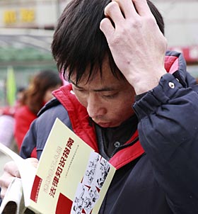 法律日益成為打工者手中的工具和武器 2月18日,來自安徽的務工人員魏磊在上海火車站南廣場翻閱派發(fā)的法律知識指南。當日,上海市閘北區(qū)司法局、法院、勞動局、民政局等單位在上;疖囌灸蠌V場舉辦春運法制宣傳活動,現(xiàn)場為返滬務工人員提供相關政策和法律的咨詢服務,引導他們自覺遵守法律、法規(guī),依法維護自身合法權益。新華社記者