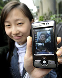 4月1日,廣州市民丁梅在展示剛開(kāi)戶的3G手機(jī),她正在與另一位3G手機(jī)用戶進(jìn)行可視通話。新華社記者:劉大偉