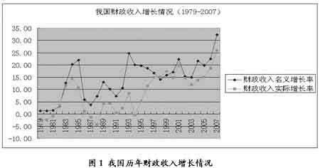 、7110.91萬元,2007年實現財政收入5.13萬億元,比上年增長1.25億元。從增長率來看,在不同年份存在波動,但近三年財政收入增長率呈加速上升趨勢,其中2007年名義增長率從2006年的22.47%提高到32.36%,提升了近10個百分點,實際增長率(實際財政收入是以GDP平減指數剔除價格影響后的實際值)從2006年的18.62%提高到26.08%,提升了7.5個百分點。也就是說,從增長的絕對指標和相對指標兩方面分析,能夠得到2007年財政收入超常規(guī)增長的結論。(見圖1) 與GDP的增長對比來看,改革開放以來,我國GDP實現了較大增長,2007年GDP達到24.66萬億元,比1978年的3645.2億元增長了66.7倍,比2002年增長65.5%。近五年來,我國GDP年均增長10.6%,而名義財政收入年均增長21.09%,實際財政收入年均增長16.69%,相比之下,財政收入增長速度明顯高于GDP的增長速度。財政收入占GDP的比率在改革開放后的20年間持續(xù)下降,從1978年的31.06%下降到1996年的10.41%,1997年這種下降勢頭開始得到扭轉,并在近10年間穩(wěn)步上升,從1997年的10.95%上升到2007年的20.8%,年均上升約1個百分點,尤其是2007年該比率比2006年上升了2.4個百分點,表現出明顯加速的勢頭。從增量對比來看,財政收入增量占GDP增量的比重近五年逐年升高,其中2006、2007兩年顯著上升。 我國財政收入占GDP比重的升高以及財政收入與GDP的相對增長速度加快說明財政集中程度和財政能力在提高,但同時也可能加重經濟的超額負擔,因此,財政收入持續(xù)快速增長對宏觀經濟和微觀經濟是否存在較大的負面影響成為社會關注的焦點。
