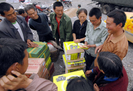 米22斤,面8斤,礦泉水2瓶。這是5月25日晨,四川省綿陽市平武縣南壩鎮(zhèn)冒水頭村婦女文小蕓排隊領到的救災物資。“加上自家有的,我們不渴不餓!蔽男∈|說,“就是睡得有點擠,要是再能多領點彩條布搭帳篷就更好了。” 遠遠望去,南壩鎮(zhèn)的河灘就像一個巨大的露天倉庫。成堆的礦泉水、方便面、糧油和被褥、帳篷等物資分類堆放一邊,顯得整齊有序。另一邊,是南壩鎮(zhèn)各個鄉(xiāng)村趕來領取救災物資的受災群眾,他們大部分背著背簍;個別通路的村,則開上了拖拉機和摩托車。 在現(xiàn)場負責分發(fā)物資的南壩鎮(zhèn)黨委副書記王青龍說,現(xiàn)在的救災物資由平武縣抗震救災指揮部統(tǒng)一調(diào)撥。由縣分發(fā)到鎮(zhèn),鎮(zhèn)分發(fā)到各鄉(xiāng)村,鄉(xiāng)村再分發(fā)到合作社和村民小組。 記者看到,物資發(fā)放必須由村委會主任或村黨支部書記去登記本村人口總數(shù),再由專人領到物資堆放點領取,由村負責人再進一步登記、分發(fā)到每一戶村民手中。 王青龍說,南壩鎮(zhèn)受災群眾估算有2.6萬多人,從災情發(fā)生至今,平均每天每人領到1斤大米,每戶1箱方便面、1盒罐頭,礦泉水、牛奶4戶1箱,大村發(fā)放帳篷30個,小村發(fā)放帳篷20個,此外,奶粉等物資專向3歲以下嬰幼兒發(fā)放。 正在登記發(fā)放物資的冒水頭村村委會主任文樹成告訴記者,他們村有200戶710多人,領到大米700斤,被褥、方便面、礦泉水和食鹽、蔬菜、牛奶若干!皽仫柌怀蓡栴}!蔽臉涑烧f。 記者從平武縣委宣傳部了解到,截至5月24日,平武縣抗震救災指揮部累計接收方便食品63490件,向平武、南壩、平同和響巖四個點發(fā)放方便食品55692件;帳篷4311頂,發(fā)放3527頂;接受捐贈糧食797.97噸,發(fā)放276.59噸。 坐在拖拉機上照看半車方便面的黨家溝村村民蔣燕說,“目前村里不缺藥,小孩的奶粉還缺。但我們在這么大的地震后還能有吃有住,真的感謝黨和政府,感謝幫助我們的所有人!