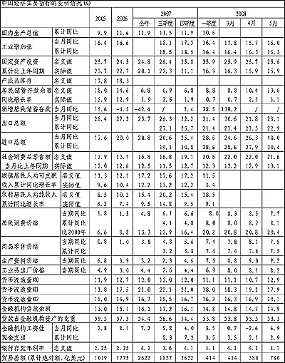 注:工業(yè)增加值的季度和月度數(shù)為國(guó)有工業(yè)和產(chǎn)值在500萬(wàn)元以上的其他工業(yè)企業(yè);固定資產(chǎn)投資季度數(shù)和月度數(shù)的統(tǒng)計(jì)口徑為城鎮(zhèn)50萬(wàn)元以上項(xiàng)目的投資;農(nóng)村居民收入的季度數(shù)為現(xiàn)金收入;部分當(dāng)月指標(biāo)為估算數(shù)。 | 5月份,我國(guó)經(jīng)濟(jì)總體狀況基本穩(wěn)定,居民消費(fèi)價(jià)格漲幅明顯回落,貨幣供應(yīng)量M1的增長(zhǎng)呈緩慢回落走勢(shì),但進(jìn)出口增長(zhǎng)速度明顯加快。有兩個(gè)因素對(duì)當(dāng)月經(jīng)濟(jì)狀況構(gòu)成了較大沖擊,一是汶川大地震對(duì)宏觀經(jīng)濟(jì)的影響;二是取消“五一”長(zhǎng)假的影響。必須考慮到這兩個(gè)因素的影響后才能作較為準(zhǔn)確的判斷。