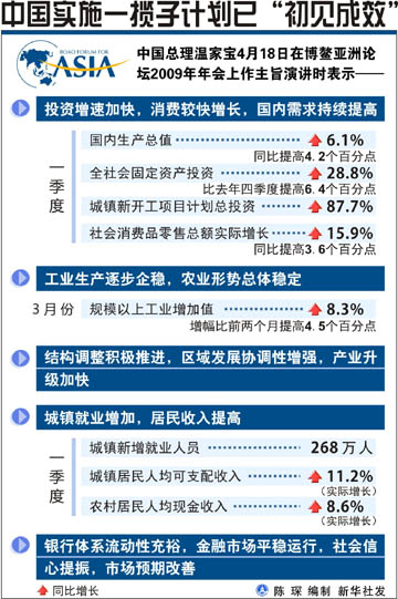 2009年第一季度的宏觀經(jīng)濟(jì)處于全球金融危機(jī)深化和積極財(cái)政政策與適度穩(wěn)健貨幣政策的共同影響之下,總體形勢(shì)處于震蕩期。從各項(xiàng)指標(biāo)看,雖然擴(kuò)大內(nèi)需、促進(jìn)經(jīng)濟(jì)平穩(wěn)較快發(fā)展的一攬子計(jì)劃已經(jīng)初見成效,經(jīng)濟(jì)運(yùn)行表現(xiàn)出許多積極特點(diǎn),但仍處于下行區(qū)間。這一階段經(jīng)濟(jì)發(fā)展的特點(diǎn)包括:(1)經(jīng)濟(jì)增長(zhǎng)速度趨緩,但總體形勢(shì)好于預(yù)期;(2)外部需求持續(xù)萎縮,中國(guó)外貿(mào)、外資形勢(shì)嚴(yán)峻;(3)固定資產(chǎn)投資增長(zhǎng)加快,投資結(jié)構(gòu)有所改善;(4)消費(fèi)保持較快增長(zhǎng),國(guó)內(nèi)需求穩(wěn)步提高;(5)銀行體系流動(dòng)性充裕,貨幣信貸快速增加;(6)工業(yè)生產(chǎn)逐步企穩(wěn),農(nóng)業(yè)生產(chǎn)形勢(shì)總體穩(wěn)定,金融企業(yè)經(jīng)營(yíng)狀況良好。