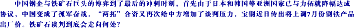 此前中鋼協(xié)已經(jīng)態(tài)度明確地拒絕了日本新日鐵與力拓達(dá)成的首發(fā)價(jià)。單尚華說(shuō):“現(xiàn)在中國(guó)買現(xiàn)貨礦比日本談出來(lái)的價(jià)格要便宜七八美元/噸。我們的底線沒(méi)有改變!倍鴮(duì)于談判將在6月底見分曉,單尚華直言:“什么時(shí)候達(dá)到中方底線,什么時(shí)候結(jié)束談判!