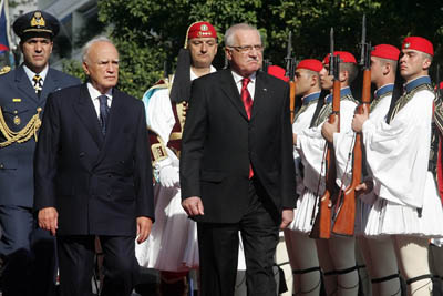 11月22日,在希臘首都雅典,希臘總統(tǒng)帕普利亞斯(前左)為捷克總統(tǒng)克勞斯(前中)舉行歡迎儀式。帕普利亞斯當天呼吁歐盟盡快采取措施,以加快歐盟政治一體化進程,提高歐盟在擴大后應對各種挑戰(zhàn)的能力。