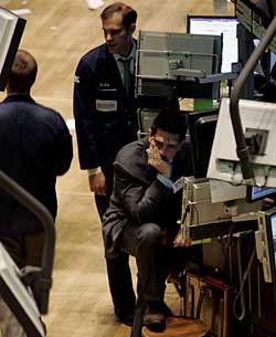 3月28日,受美國聯(lián)邦儲(chǔ)備委員會(huì)主席伯南克講話及油價(jià)上漲等因素影響,當(dāng)天紐約股市全面下挫,道瓊斯30種工業(yè)股票平均價(jià)格指數(shù)下跌近100點(diǎn)。新華社/路透 |
