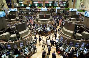 23日,美國紐約證券交易所股票交易大廳一片繁忙。當(dāng)日,道瓊斯指數(shù)盤中創(chuàng)下12983.92點(diǎn)的歷史新高后,收盤下跌42.58點(diǎn),收于12919.40點(diǎn),跌幅為0.33%。新華社記者
