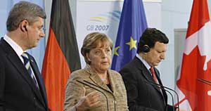 4日,德國總理默克爾(中)、加拿大總理哈珀(左)與歐盟委員會主席巴羅佐在德國柏林出席聯(lián)合記者招待會。新華社/法新 | 八國集團(tuán)首腦會議于6日在德國北部海濱小城海利根達(dá)姆召開。與會領(lǐng)導(dǎo)人將討論氣候變化、能源安全、投資自由化、知識產(chǎn)權(quán)保護(hù)及非洲發(fā)展等一系列全球問題,并將與包括中國在內(nèi)的發(fā)展中大國領(lǐng)導(dǎo)人舉行對話。 會議東道主、八國集團(tuán)今年的主席國德國希望本屆峰會在環(huán)保和社會責(zé)任等方面能夠制定出新的“游戲規(guī)則”,搭建未來全球化發(fā)展的框架。然而,在當(dāng)今各國利益相互融合又激烈競爭的背景下,制定兼顧各方利益的新規(guī)則談何容易。本屆八國峰會在這方面到底能取得多大成果,格外引人關(guān)注。