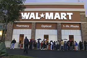圖為美國(guó)芝加哥市民排隊(duì)進(jìn)入沃爾瑪購(gòu)物。本報(bào)資料照片 | 美國(guó)《財(cái)富》雜志7月23日一期將刊登2007年全球500強(qiáng)排行榜,根據(jù)其提前公布的排行榜榜單,盡管較去年有所變化,沃爾瑪、?松梨诘热蛑髽I(yè)均仍高居各榜單榜首位置,中國(guó)國(guó)家電網(wǎng)公司、中石油、中石化等眾多中國(guó)企業(yè)也位于各排行榜前列。