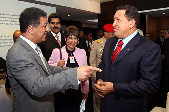 11日,委內(nèi)瑞拉總統(tǒng)查韋斯(前右)在委內(nèi)瑞拉首都加拉加斯與參加“加勒比石油計劃”締約國第三屆首腦會議的多米尼加總統(tǒng)萊昂內(nèi)爾·費爾南德斯(前左)交談。
