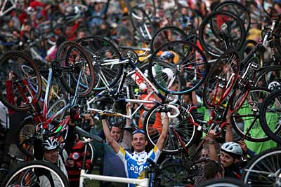 22日,匈牙利的自行車愛好者們在首都布達佩斯的一個公園里將自行車高高舉起。當日,匈牙利的自行車愛好者們在布達佩斯游行,慶!盁o車日”!盁o車日”又稱“不駕車進城日”,最早于1998年9月22日由法國率先發(fā)起。