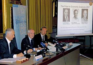 瑞典皇家科學(xué)院于北京時(shí)間15日晚7時(shí)宣布,將2007年度諾貝爾經(jīng)濟(jì)學(xué)獎(jiǎng)授予萊昂尼德·赫維奇、埃里克·馬斯金和羅杰·邁爾森三位美國(guó)經(jīng)濟(jì)學(xué)家,以表彰他們?cè)趧?chuàng)立和發(fā)展“機(jī)制設(shè)計(jì)理論”方面的巨大貢獻(xiàn)。 瑞典皇家科學(xué)院在聲明中指出,“機(jī)制設(shè)計(jì)理論”在當(dāng)代經(jīng)濟(jì)學(xué)和政治科學(xué)領(lǐng)域扮演著十分重要的角色,最早在1960年由赫維奇提出,馬斯金和邁爾森則進(jìn)一步發(fā)展了該理論。這一理論有助于經(jīng)濟(jì)學(xué)家、各國(guó)政府和企業(yè)識(shí)別在哪些情況下市場(chǎng)機(jī)制有效,而哪些情況下市場(chǎng)機(jī)制無(wú)效。此外,借助“機(jī)制設(shè)計(jì)理論”,人們還可以確定最佳和最有效的資源分配方式。