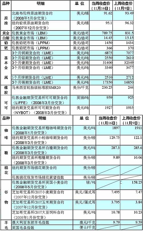 當(dāng)周美元對歐元匯率的穩(wěn)定使得多數(shù)金屬價格呈下跌態(tài)勢。繼前一周創(chuàng)下每盎司845.84美元的27年新高后,倫敦市場黃金期貨價格大幅回調(diào),當(dāng)周收于每盎司789.75美元。除錫價外,基本金屬價格全線走低,倫敦市場銅期貨收盤價已跌破每噸7000美元大關(guān)。巴克萊公司分析師稱,錫價之所以能逆市上行并創(chuàng)下每噸17575美元的歷史高位,主要因為市場對未來供給的擔(dān)心進(jìn)一步激發(fā)了買盤的興趣。 另一方面,當(dāng)周英鎊對美元匯率的大幅下跌推高了以英鎊計價的倫敦市場可可和白糖的期貨價格。因為對于以美元進(jìn)行支付的國際購買者來說,英鎊走軟相對降低了這些大宗商品的價格,進(jìn)而導(dǎo)致市場購買興趣的提高。 繼本月7日觸及每桶98.62美元的歷史高位后,紐約原油期貨價格便開始掉頭向下,在過去一周內(nèi)徘徊于91美元至95美元之間。分析人士稱,美國原油商業(yè)庫存意外增加、國際機構(gòu)調(diào)低能源需求預(yù)測、歐佩克增產(chǎn)傳聞以及投機商陸續(xù)離場是國際油價當(dāng)周出現(xiàn)回調(diào)的原因。 美國能源部15日公布,在截至9日的一周里,美國原油商業(yè)庫存增加280萬桶,大大超出此前市場人士預(yù)計的30萬桶。當(dāng)天,歐佩克將其對四季度全球原油需求增長率的預(yù)測從一個月前的2.1%下調(diào)至1.97%。此外,歐佩克秘書長巴德里近日也表示,為了平抑油價,歐佩克準(zhǔn)備隨時增產(chǎn)。 受累于原油和小麥?zhǔn)袌龅钠,芝加哥市場玉米期貨?dāng)周震蕩走弱。相反,芝加哥市場大豆期貨一舉躍至19年高位。分析人士稱,當(dāng)周原油和黃金市場對大豆走勢的影響暫時退居次席,中國需求成為多頭市場炒作的依據(jù)。