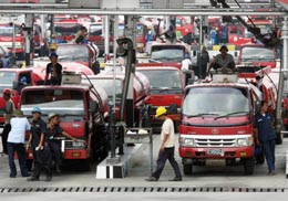 在印度尼西亞首都雅加達(dá),卡車司機(jī)等待加油。(本報(bào)資料照片) |