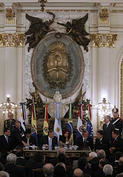 9日,厄瓜多爾總統(tǒng)科雷亞、玻利維亞總統(tǒng)莫拉萊斯、阿根廷總統(tǒng)基什內(nèi)爾和當(dāng)選總統(tǒng)克里斯蒂娜·費(fèi)爾南德斯、巴西總統(tǒng)盧拉、巴拉圭總統(tǒng)杜阿爾特、委內(nèi)瑞拉總統(tǒng)查韋斯(從左至右)在阿根廷首都布宜諾斯艾利斯出席南方銀行成立的簽字儀式。新華社發(fā) | 本報(bào)布宜諾斯艾利斯電