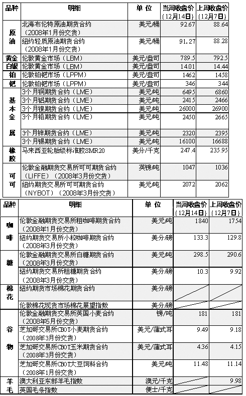 美國農(nóng)業(yè)部11日的報告稱,到本銷售年度結(jié)束時(明年5月31日),美國小麥庫存將僅為2.8億蒲式耳(762萬噸),為60年來最低。同為小麥出口大國的阿根廷和澳大利亞由于受到干旱天氣的影響,小麥產(chǎn)量和出口量也明顯減少。另一方面,消費國則不斷向國際市場尋求購買小麥。 受美聯(lián)儲降息和美國原油庫存下降等因素影響,國際油價強勁反彈,之后由于美元走強以及投資者擔(dān)心原油需求將減少,紐約市場油價連續(xù)兩天走低,但仍收于每桶90美元上方。 美聯(lián)儲11日宣布,將聯(lián)邦基金利率下調(diào)0.25個百分點至4.25%,當(dāng)日國際油價重回每桶90美元上方。市場人士認(rèn)為,降息可以阻止美國經(jīng)濟(jì)陷入衰退并增加能源需求,同時可以使以美元計價的原油以及原油產(chǎn)品對持有其他貨幣的購買者更具吸引力。 受美元升值因素影響,黃金和白銀期貨價格均小幅回落,其中倫敦市場黃金期貨價格當(dāng)周收于每盎司789.5美元。數(shù)據(jù)顯示,美元對其他幾種主要貨幣的匯率14日升至7周以來最高點。市場人士認(rèn)為,美元升值使以美元計價的大宗商品對其他貨幣的持有者顯得“更加昂貴”。 由于市場對美國經(jīng)濟(jì)放緩的擔(dān)憂仍未消除,基本金屬價格繼續(xù)走低,倫敦市場銅期貨價已跌至每噸6495美元。 遭遇暴雨襲擊后,橡膠主產(chǎn)地——馬來西亞和泰國南部地區(qū)洪水泛濫,橡膠價格因供給趨緊而攀升。受主要出口國科特迪瓦爆發(fā)的大罷工影響,可可價格也反彈至7月來最高點。