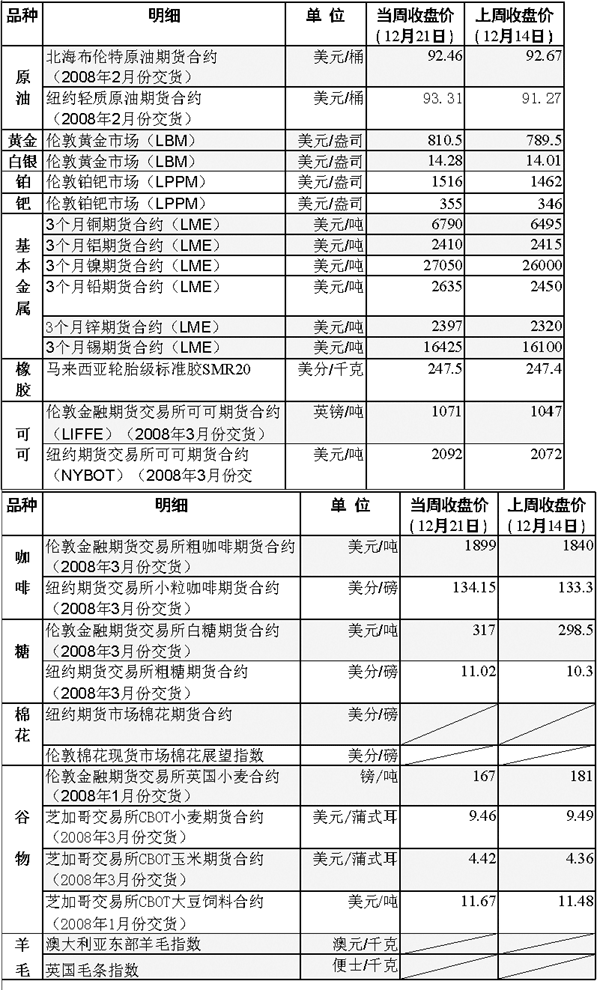 倫敦市場鉑價(jià)當(dāng)周創(chuàng)下每盎司1523.5美元的歷史新高。分析人士稱,由于主產(chǎn)地南非的鉑開采量受到了大罷工的影響,市場對供給趨緊的擔(dān)心加劇,推動(dòng)了買盤的增加,導(dǎo)致鉑價(jià)近期走高。 專業(yè)人士杰姆斯·莫爾介紹說,鉑可以用于珠寶加工和汽車用催化劑的生產(chǎn),這種白色金屬的價(jià)格今年以來已攀升35%,未來還有進(jìn)一步走高的可能。有數(shù)據(jù)顯示,今年年底全球?qū)︺K的需求將超出供給26.5萬盎司,而去年年底還是供過于求的狀態(tài)。 受美元對歐元比價(jià)下跌等因素影響,倫敦市場黃金期貨價(jià)格再次回到每盎司800美元上方。 基本金屬價(jià)格略有波動(dòng)。起初由于市場對美國乃至全球經(jīng)濟(jì)放緩的擔(dān)憂加劇,基本金屬價(jià)格繼續(xù)走低,倫敦市場銅期貨價(jià)格一度跌至今年3月以來的最低,后期隨著市場的擔(dān)憂減緩,基本金屬價(jià)格又有所上揚(yáng)。 當(dāng)周國際油價(jià)運(yùn)行平穩(wěn),分析人士稱,2007年國際油價(jià)在經(jīng)歷了大起大落后,很有可能會在年末的最后幾個(gè)交易日中采取區(qū)間內(nèi)運(yùn)行的方式。當(dāng)周影響國際油價(jià)走勢的兩大因素是前一周美國原油庫存數(shù)據(jù)和美國11月份消費(fèi)開支變動(dòng)情況。美國能源部19日發(fā)布的庫存報(bào)告顯示,前一周美國原油商業(yè)庫存驟降760萬桶,大大高于市場150萬桶降幅的預(yù)期值,該消息導(dǎo)致當(dāng)天的國際油價(jià)應(yīng)聲上揚(yáng)。美國商務(wù)部21日公布的數(shù)據(jù)顯示,11月份美國消費(fèi)開支增長1.1%,為2004年5月以來最大增幅。這一最新的消費(fèi)數(shù)據(jù)緩解了投資者對美國經(jīng)濟(jì)走軟影響國際原油需求的擔(dān)心,推動(dòng)了國際油價(jià)的走高。 可可主產(chǎn)地科特迪瓦22日正式重啟解除武裝進(jìn)程,市場緊張氣氛加劇,紐約市場可可期貨價(jià)當(dāng)周一度升至每噸2147美元,為2003年2月來最高。 受小麥?zhǔn)袌龅馁I盤帶動(dòng),芝加哥玉米期貨價(jià)17日沖至11年最高,為連續(xù)第12個(gè)交易日收高。分析人士稱,技術(shù)面強(qiáng)勁且缺乏賣家成為其價(jià)格持續(xù)攀升的關(guān)鍵因素。其后,該種期貨價(jià)格就開始向下修正,但鑒于近期玉米期貨的漲幅較大,跌勢還算溫和。