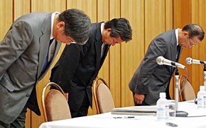 25日,三洋電機公司總裁佐野精一郎(中)與公司其他管理人員出席在日本大阪舉行的新聞發(fā)布會。新華社/法新 | 東京證券交易所25日說,三洋電機公司誤報6年財務(wù)數(shù)據(jù),將可能面臨摘牌危險。三洋公司在連續(xù)3年虧損后剛剛出現(xiàn)盈利,此次遭遇摘牌危機,三洋將可能被迫繼續(xù)其重組進程。 東京證交所當天在自己網(wǎng)站上發(fā)表聲明說,已將三洋公司股票移至監(jiān)控板塊,證交所計劃展開審查,決定是否將其摘牌。聲明說:“三洋公司修改業(yè)績報表數(shù)據(jù)的做法非同尋常。證交所將展開進一步審查……三洋公司可能被摘牌! 日本信近資產(chǎn)管理公司首席基金管理人藤遠直紀(音譯)說,三洋如果遭摘牌,將被迫繼續(xù)重組。 2006年,高盛公司、大和證券和住友三井金融集團曾聯(lián)合向三洋公司注資26億美元,將三洋公司拖出破產(chǎn)邊緣。同時,身為創(chuàng)業(yè)者的三洋公司原董事長井植敏雅和父親井植敏辭職,三洋公司開始金融機構(gòu)主導(dǎo)下的重組與再建。 為探索新的發(fā)展方向,三洋公司先后出售平板顯示器合資企業(yè),以及一家在泰國的冰箱制造企業(yè),同時投巨資生產(chǎn)可充電電池。 三洋公司總裁佐野精一郎25日承諾,不會再犯同樣錯誤。佐野精一郎當天在新聞發(fā)布會上說:“我們非常重視修改業(yè)績報表一事,三洋公司將建立一套體系,防止這種錯誤再次發(fā)生! 三洋公司表示,修改業(yè)績數(shù)據(jù)是因為低估了半導(dǎo)體、液晶顯示器部門的虧損。 總部位于大阪的三洋公司25日說,自2001財政年度至2006財政年度,公司凈虧損4845億日元(約合42.4億美元),高于先前公布的4786億日元(約合41.5億美元)。 三洋公司同時宣布,將削減行政人員薪水,停止向董事會成員發(fā)放退休金。三洋決定,扣發(fā)16名前董事會成員與13名現(xiàn)董事會成員的退休金;將公司總裁和執(zhí)行副總裁6個月工資削減60%,其他一些高級職員也將被削減工資。 日本證券交易監(jiān)視委員會建議對三洋公司處以830萬日元(約合7.265萬美元)罰款。三洋公司股價25日下跌3.6%。 在連續(xù)3年虧損后,三洋公司2007財年上半年度剛剛出現(xiàn)盈利。 (新華社專稿)