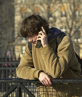 圖為一青年人在巴黎塞納河畔打手機。本報資料照片 |