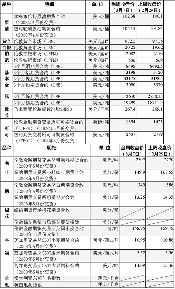 當(dāng)周,國(guó)際油價(jià)延續(xù)了上周的升勢(shì),交易首日就在真正意義上“創(chuàng)了新高”,之后依舊保持升勢(shì),并頻頻刷新紀(jì)錄。當(dāng)周最后一個(gè)交易日,紐約商品交易所輕質(zhì)原油期貨價(jià)格更是創(chuàng)下每桶106.54美元的歷史最高盤中價(jià)。 美元匯率頻創(chuàng)新低是導(dǎo)致當(dāng)周油價(jià)屢攀新高的主要原因。除4日外,當(dāng)周其他4個(gè)交易日紐約匯市歐元對(duì)美元匯率均不斷創(chuàng)新高,美元走軟增加了以美元計(jì)價(jià)的原油期貨作為投資商品的吸引力。此外,美國(guó)原油商業(yè)庫(kù)存意外下降以及石油輸出國(guó)組織(歐佩克)決定暫時(shí)維持產(chǎn)量不變等因素也對(duì)油價(jià)上漲起到了一定的助推作用。 不過,許多分析人士認(rèn)為,目前油價(jià)飆升趨勢(shì)是暫時(shí)的。從供應(yīng)方面看,盡管前一周美國(guó)原油商業(yè)庫(kù)存下降,但其總體水平仍處于歷史高點(diǎn)。與之形成對(duì)比的是,需求方面則持續(xù)低迷。數(shù)據(jù)顯示,過去4周里,市場(chǎng)對(duì)原油及其產(chǎn)品的整體需求比上年同期下降了3.4%。 受美元持續(xù)疲軟的影響,貴金屬價(jià)格紛紛上揚(yáng)。倫敦市場(chǎng)黃金期貨價(jià)格在6日升至每盎司992.50美元的歷史新高,鉑期價(jià)漲至每盎司2301.50美元的歷史最高點(diǎn),銀期價(jià)則攀至27年來的新高——每盎司21.22美元。 據(jù)倫敦金屬交易所跟蹤調(diào)查,銅庫(kù)存目前處于自去年10月份以來的最低水平,加上需求強(qiáng)勁、美元疲軟以及投資基金涌入市場(chǎng)等因素影響,倫敦市場(chǎng)3個(gè)月銅期貨合約價(jià)格一度躍至每噸8820美元的歷史最高位;錫期價(jià)則在4日漲至每噸19375美元,創(chuàng)下自1989年以來的最高紀(jì)錄。 油價(jià)上漲推動(dòng)用于生產(chǎn)乙醇燃料的玉米價(jià)格跟著走高,芝加哥玉米期貨價(jià)格5日盤中創(chuàng)下每蒲式耳5.74美元的歷史新高。此外,大豆期價(jià)3日創(chuàng)下每噸15.8625美元的歷史紀(jì)錄,但之后多頭獲利盤大面積出逃使大豆價(jià)格慘跌。
