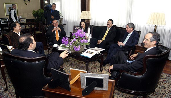 12日,在哥斯達(dá)黎加首都圣何塞,哥斯達(dá)黎加總統(tǒng)阿里亞斯(右二)、尼加拉瓜總統(tǒng)奧爾特加(左一)、洪都拉斯總統(tǒng)塞拉亞(右三)、薩爾瓦多總統(tǒng)薩卡(左前)和危地馬拉總統(tǒng)科洛姆(右一)參加工作會(huì)談。當(dāng)天,中美洲5國(guó)總統(tǒng)在圣何塞發(fā)表聲明,要求歐盟在未來(lái)與中美洲的雙邊伙伴關(guān)系協(xié)定談判中建立一套“真正的自由貿(mào)易體系”,使雙邊貿(mào)易“更加公正”。 | |