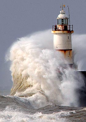 在英國(guó)英格蘭南部的薩塞克斯,巨浪拍打著堤岸邊的燈塔。新華社/路透 | 新裝置