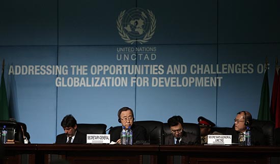 20日,聯(lián)合國(guó)秘書長(zhǎng)潘基文(中)出席在加納首都阿克拉舉行的第12屆聯(lián)合國(guó)貿(mào)易和發(fā)展大會(huì)開幕式。新華社/法新 |