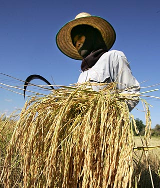 這是2004年11月18日,泰國東北部猜也蓬府的農(nóng)民在收割稻米。泰國是世界上最大的稻米出口國。新華社發(fā) | 隨著近期國際糧價不斷攀升,一些國家和組織開始著手采取對策,保障基本供給,盡力防止可能引發(fā)的糧食危機。