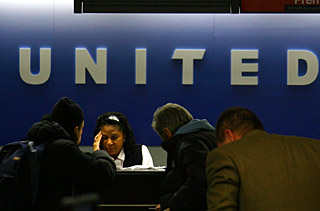 | 圖為美國聯合航空公司的工作人員在接待旅客。新華社記者 侯俊