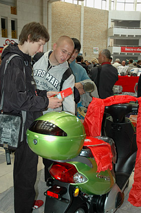 | 在俄羅斯西南部城市沃羅涅日舉行的重慶商品展上,俄羅斯觀眾被重慶生產(chǎn)的摩托車吸引。新華社記者 劉軼芳