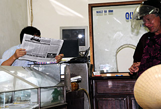 13日,在越南首都河內(nèi)市河中街一家外匯代理店,工作人員正在讀報(bào)。越南國家銀行近日出臺新規(guī)定加強(qiáng)了對外匯市場的監(jiān)控,使自由市場大部分外匯代理店生意日漸蕭條。本報(bào)記者