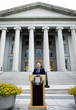 13日,在美國華盛頓,美國財政部長亨利·保爾森向媒體發(fā)表聲明。當(dāng)天,美國財政部和聯(lián)邦儲備委員會宣布出手救助陷于資金困境的住房抵押貸款融資機構(gòu)——房利美和房地美。新華社/路透 | 美國財政部和聯(lián)邦儲備委員會13日宣布出手救助陷于資金困境的美國最大兩家住房抵押貸款融資機構(gòu)——“房利美”和“房地美”,以此提振市場信心,避免美國經(jīng)濟再受沖擊。