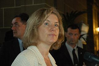 29日,印度商業(yè)和工業(yè)部長納特(上)、美國貿(mào)易代表施瓦布(下)在日內(nèi)瓦接受記者采訪。新華社記者 尚軍