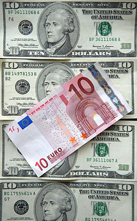 圖為歐元(上)和美元紙幣。新華社/法新 | 近一年來,美國(guó)經(jīng)濟(jì)深受次貸危機(jī)等問題困擾,加上美國(guó)聯(lián)邦儲(chǔ)備委員會(huì)連續(xù)降息,美元匯率持續(xù)下跌。但從今年7月中旬開始,美元匯率明顯反彈,歐元兌美元比價(jià)已從最高點(diǎn)1比1.6以上跌至目前的1比1.5以下。 8月22日紐約外匯市場(chǎng)尾市時(shí),歐元兌美元比價(jià)為1比1.4775,低于前一個(gè)交易日的1比1.4877。