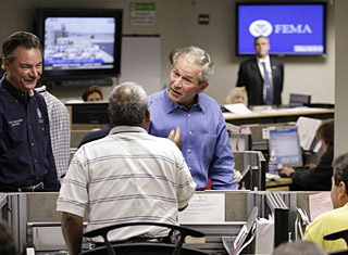 | 8月31日,美國(guó)總統(tǒng)布什(右)在位于首都華盛頓的聯(lián)邦緊急措施署總部和工作人員交談。新華社/路透 | 襲擊墨西哥灣的颶風(fēng)“古斯塔夫”于當(dāng)?shù)貢r(shí)間9月1日早登陸美國(guó),美國(guó)石油產(chǎn)業(yè)的損失備受關(guān)注,而其他行業(yè)也岌岌可危。其中,新奧爾良的支柱產(chǎn)業(yè)如旅游、船運(yùn)和產(chǎn)糖業(yè)都受到巨大威脅,可能出現(xiàn)數(shù)十億美元經(jīng)濟(jì)損失。 美國(guó)總統(tǒng)布什已提前宣布路易斯安那、得克薩斯、密西西比和亞拉巴馬4個(gè)州進(jìn)入緊急狀態(tài)。