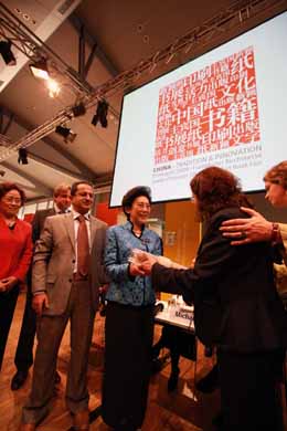 圖為19日,在德國法蘭克福會展中心,中國新聞出版總署副署長李東東(左四)從2008年法蘭克福書展主賓國土耳其主委會負(fù)責(zé)人穆埃!ぱ坡渴种薪舆^法蘭克福書展“主賓國卷軸”,這標(biāo)志著中國作為2009年法蘭克福書展主賓國活動全面啟動。新華社記者:羅歡歡 攝