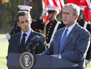 18日,美國(guó)總統(tǒng)布什(右)在馬里蘭州戴維營(yíng)發(fā)表講話。當(dāng)天,布什在會(huì)見(jiàn)到訪的法國(guó)總統(tǒng)薩科齊和歐盟委員會(huì)主席巴羅佐時(shí)宣布,美國(guó)將于近期就國(guó)際金融危機(jī)問(wèn)題主持召開(kāi)一次國(guó)際峰會(huì)。新華社/法新