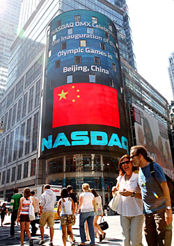 圖為2008年8月8日,在美國紐約時(shí)報(bào)廣場,納斯達(dá)克公司在其戶外大屏幕上打出慶祝北京奧運(yùn)會開幕的畫面。新華社記者